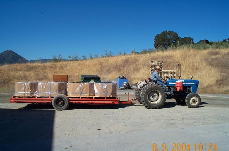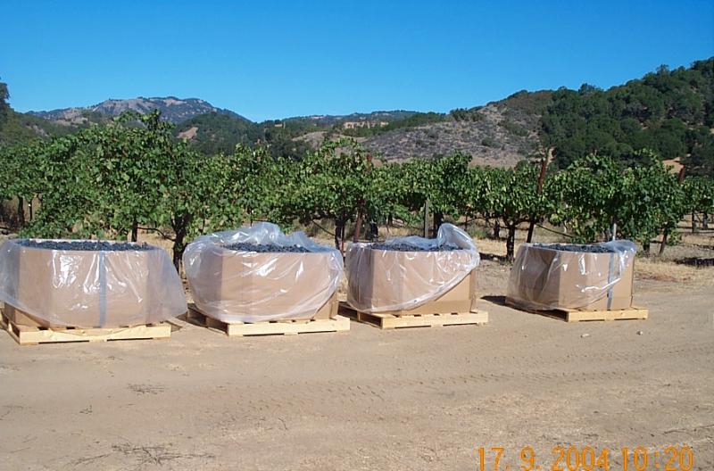 The large cardboard containers are palatalized "pumpkin" boxes that depending upon varietal hold from 750lbs to 900lbs. Thinner skinned varietals like Syrah, Zinfandel, Chardonnay are typically packed to about 750lbs to 800lbs. Thicker skinned grapes like Cabernet Sauvignon and Merlot can be packed up to 900lbs per box.
