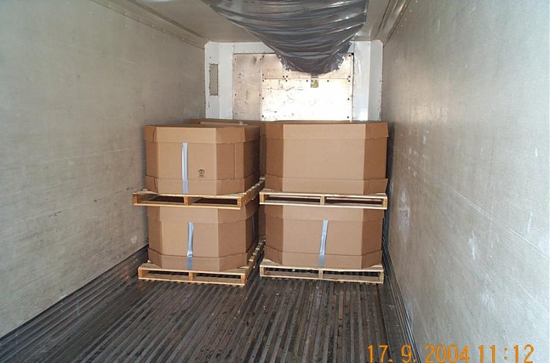 The boxes themselves are triple wall cardboard that are stapled onto a pallet. A 10ml thick liner is then inserted into the box. Prior to a lid being put on top of the box, liquid CO2 is sprayed into the center of the fruit to chill it down. Once the lid is placed on top,the boxes are stacked two high and put immediately into the waiting refrigerated truck. The refrigeration unit on the truck is kept between 33 degrees and 35 degrees for the entire trip. Each box is individually weighed and a sticker with the varietal and growers name are affixed.